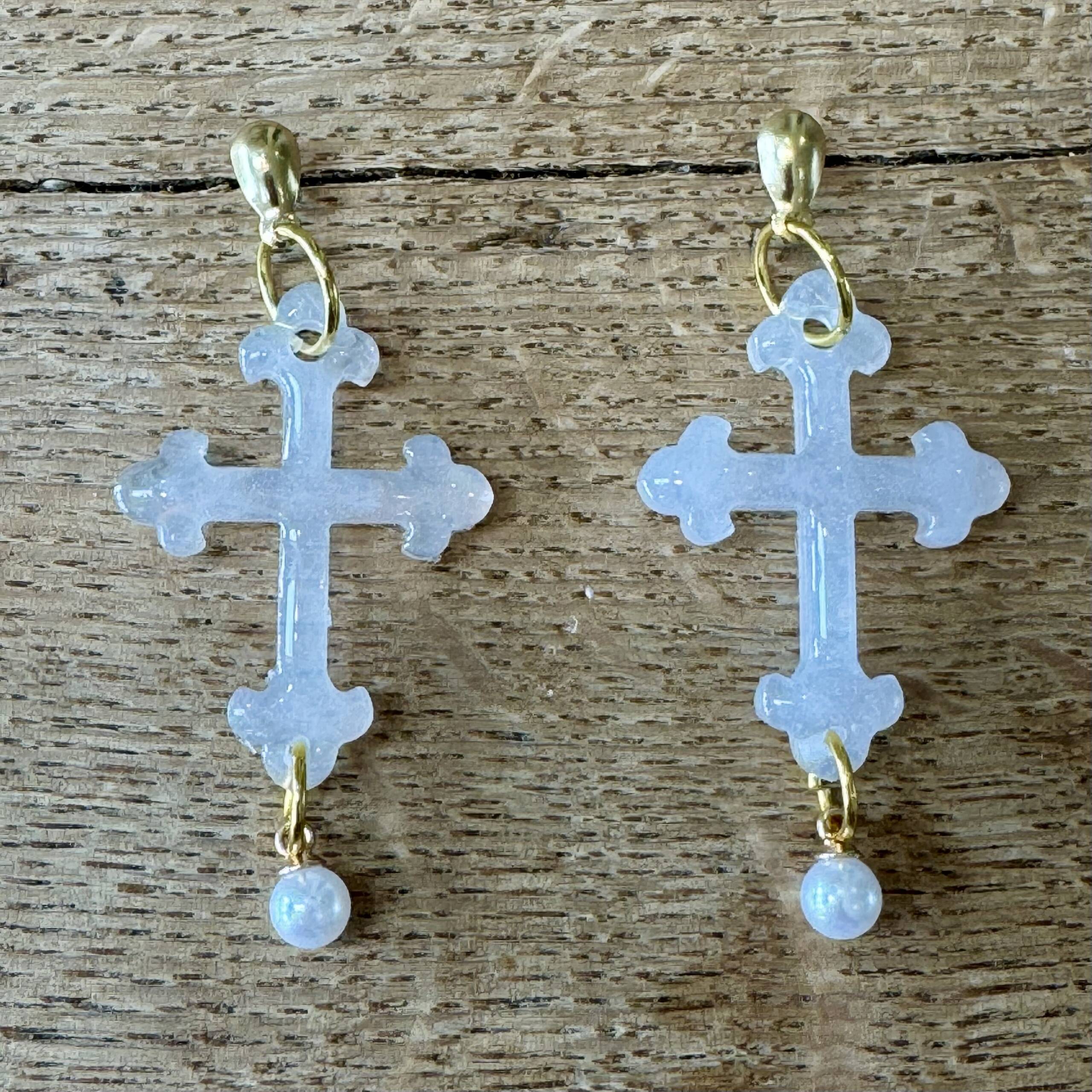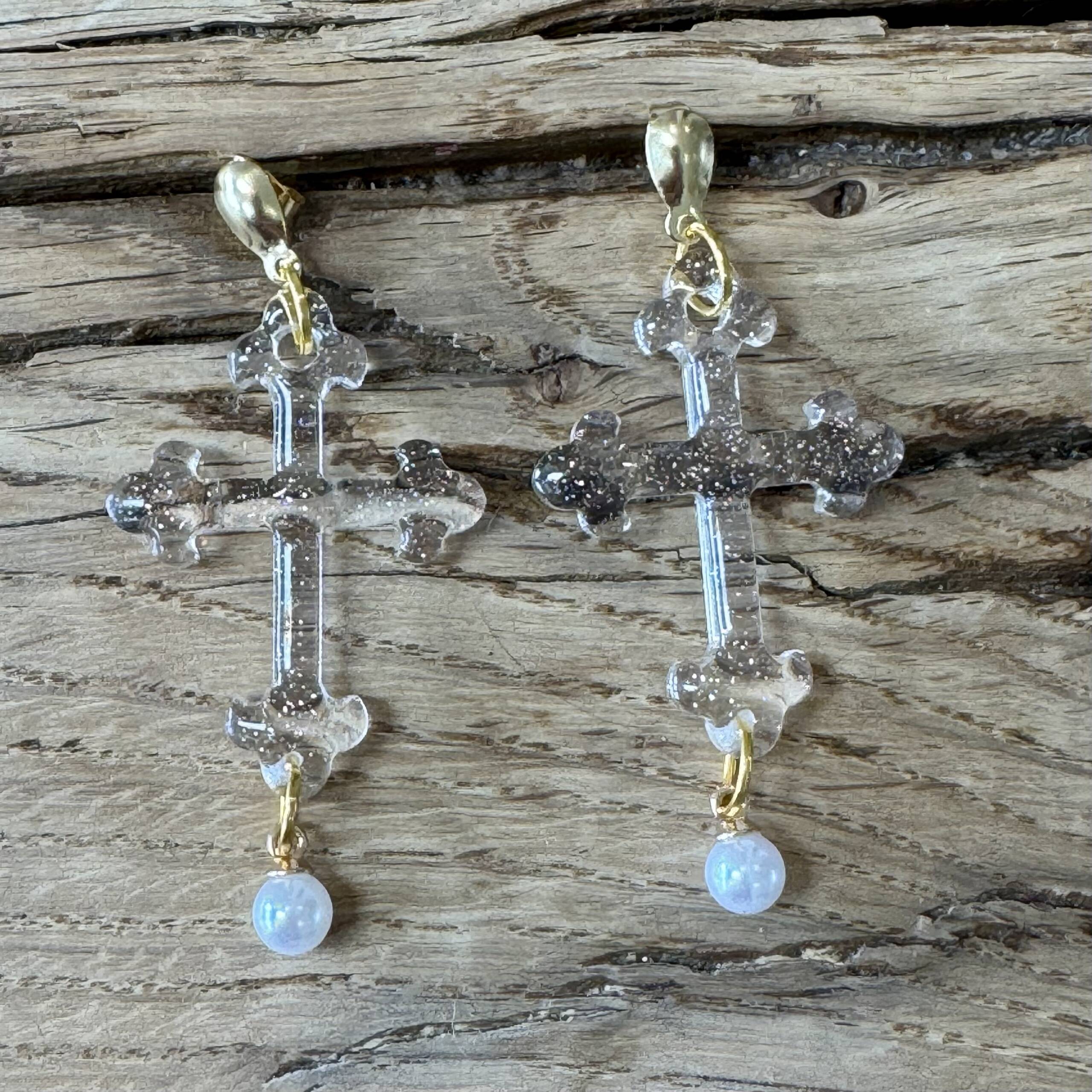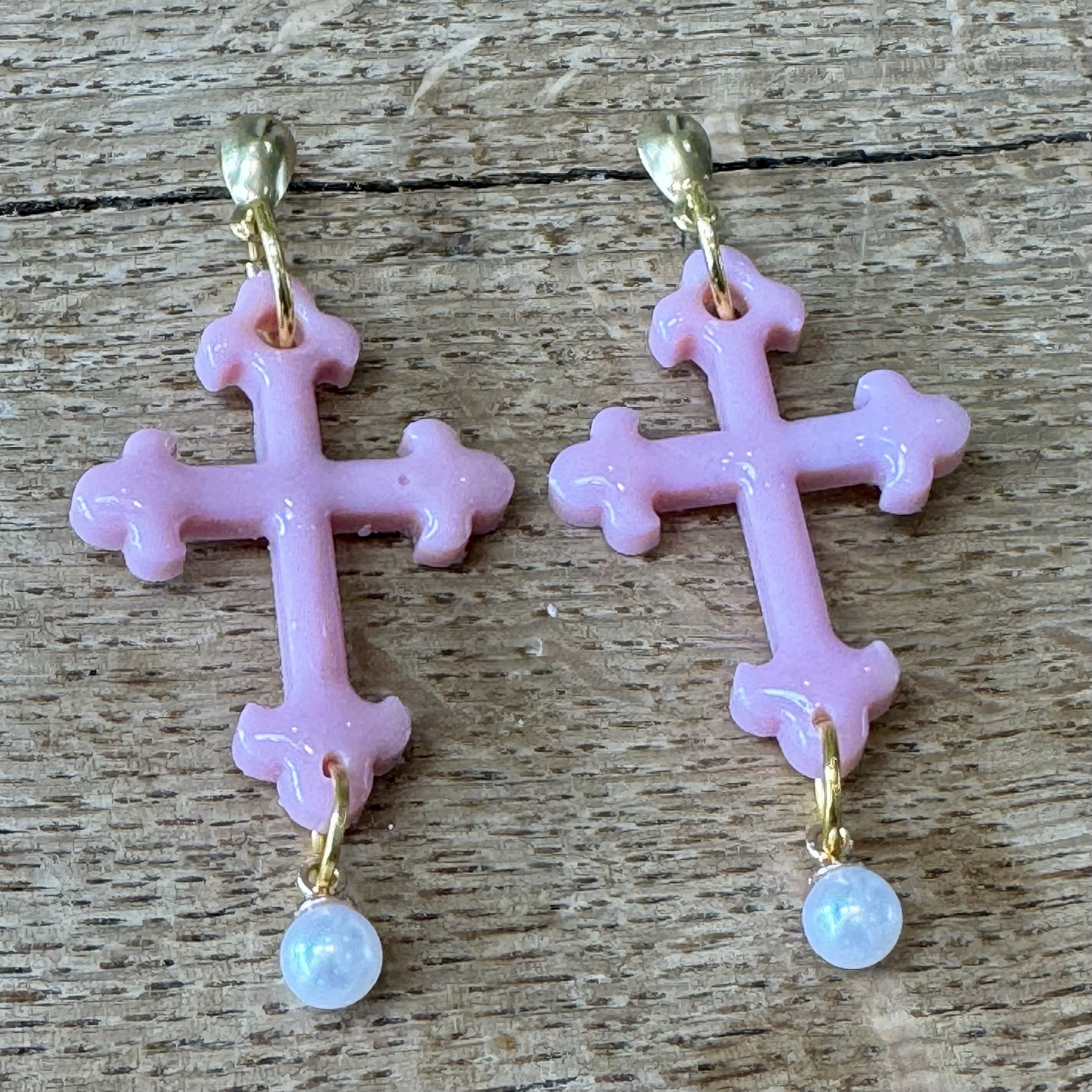 Cross shaped earrings in various colour ways with faux pearls and gold coloured findings.