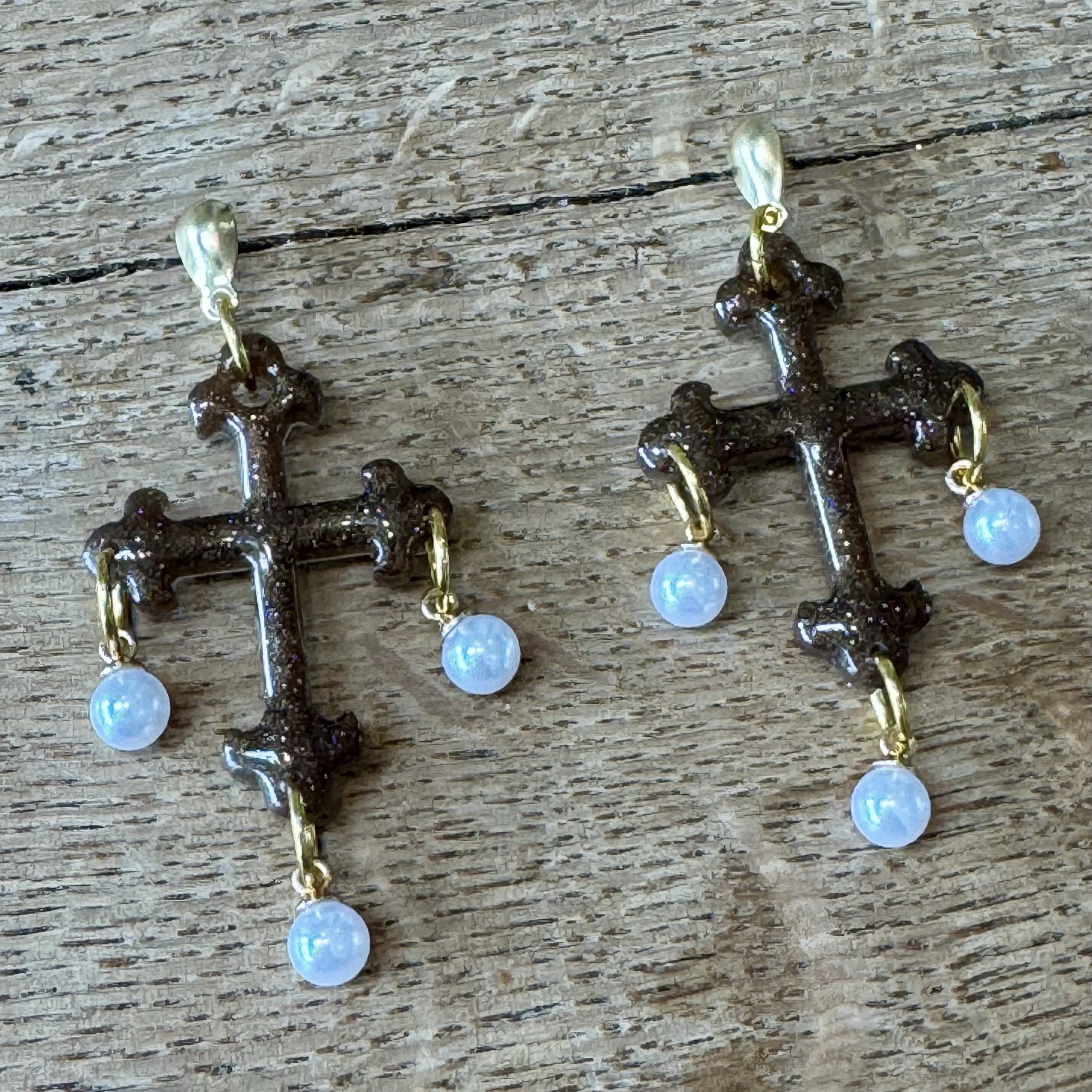 Cross shaped earrings with faux pearls and gold coloured findings.