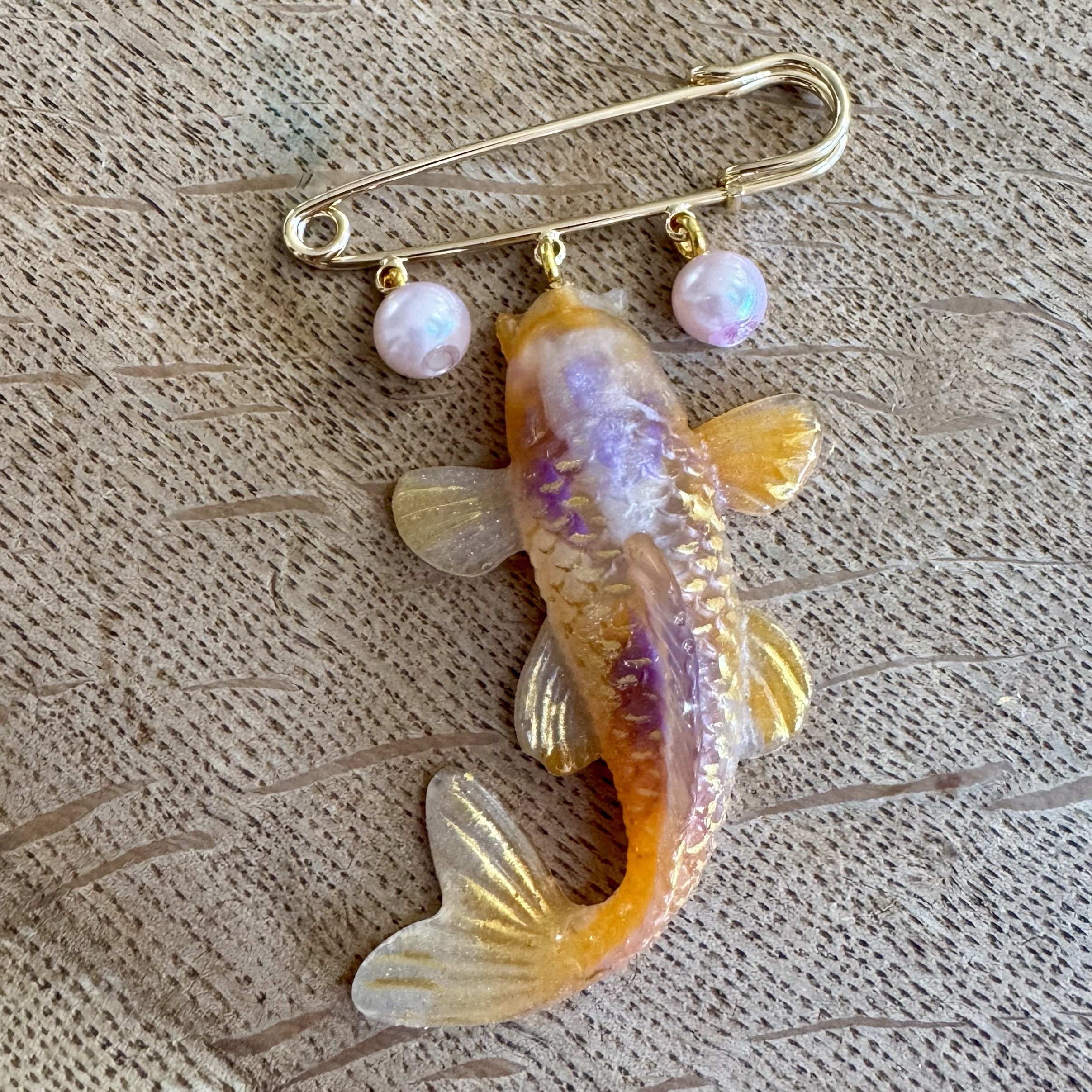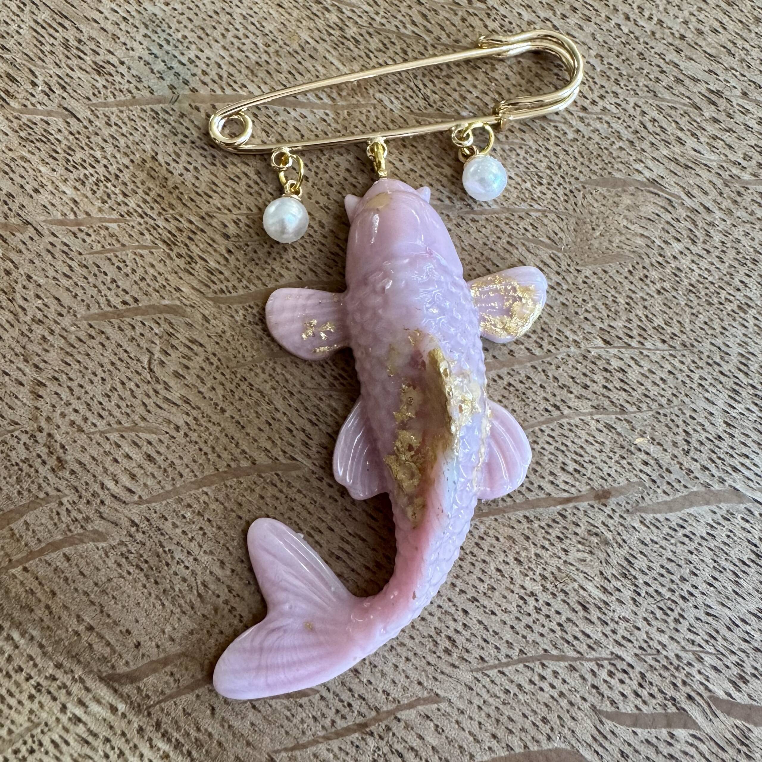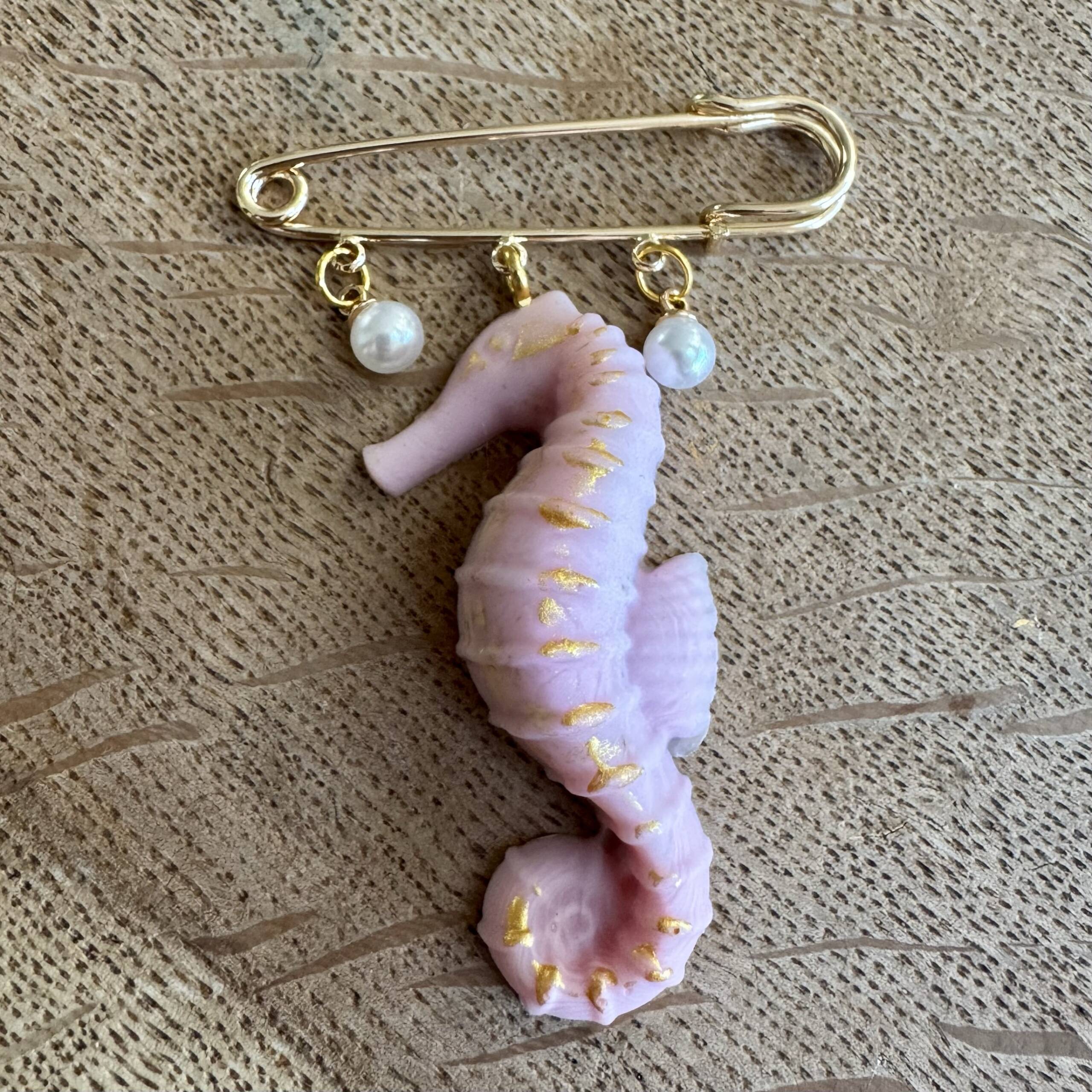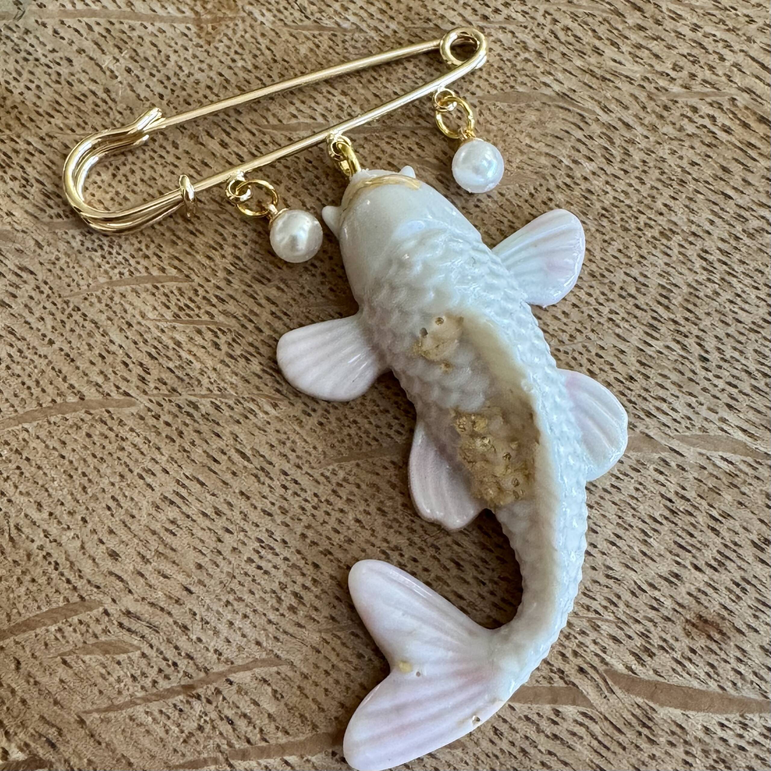 Ziherica literally means saftey pin in Bosnian. These gorgeous pin brooches comes in 5 different variations; three koi, one skull and one seahorse. All with artificial pearls and a gold coloured safety pin brooch.